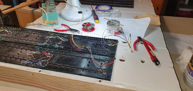 Les rails Jouef ayant la particularité d'avoir des mauvais contacts, j'ai voulu assurer le coup avec des fils electrique soudés sur chaque rail. Un raccordement de deux rails de deux voies nécessite donc quatre fils avec huit soudures. Les soudures sont réalisées avec de la pâte à étamer préalablement déposée sur le métal sous les rails.